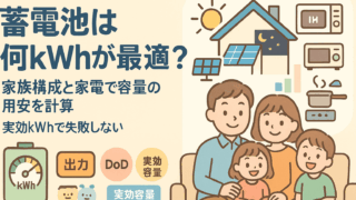 未分類 蓄電池は何kWhが最適?家族構成と家電から容量の目安を計算する方法【実効kWhで失敗しない】